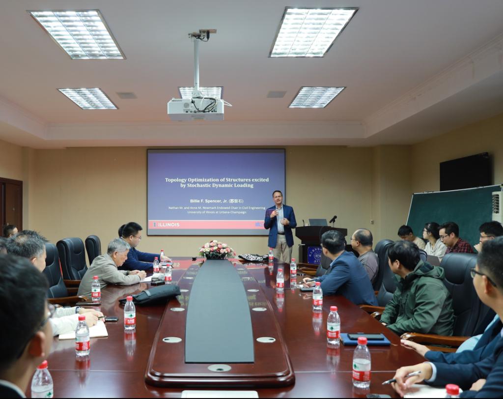 10月13日,美国伊利诺伊大学厄巴纳-香槟分校土木工程学科首席教授、UIUC Nathan M.& Anne M.Newmark 荣誉主席Billie F. Spencer Jr.应中国工程院院士陈政清邀请来校,为师生作题为《Topology Optimization of Structures excited by Stochastic Dynamic Loads》的专题讲座。土木工程学院副院长华旭刚主持讲座。