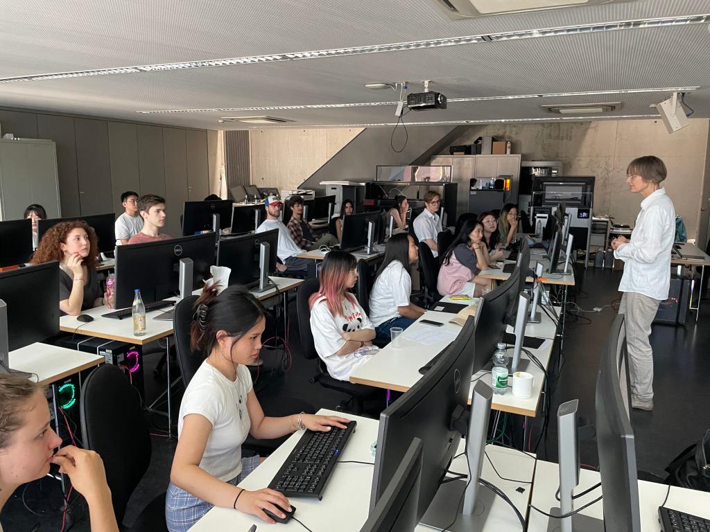 本次工作坊是一次课程融合教学尝试,主要内容是充分整合相关课程的教学成果,由两校学生组队,利用传感器或计算机视觉识别等方式,构建创新性的互动产品展示体验。在交流中,双方学生充分结合产品概念特点讨论了不同的互动展示方案,使用Python的OpenCV库、Arduino、Unity等技术平台构建了展示原型。袁翔、钟鸣老师与Cosima教授一起进行指导。